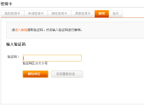 步骤二:将邮箱中收到的验证码填写至验证码输入框中,点击"解除绑定",之前的绑定的密保卡则会解除,账号恢复至未绑定密保卡状态。