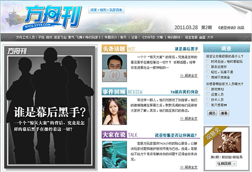 同时,为了与玩家更好的沟通,《诺亚传说》旗下荣誉出品??《方舟刊》正式于2011的3月开始发 行,玩家有了属于自己的读物,有了一个更加专业与理性的反馈和交流平台。