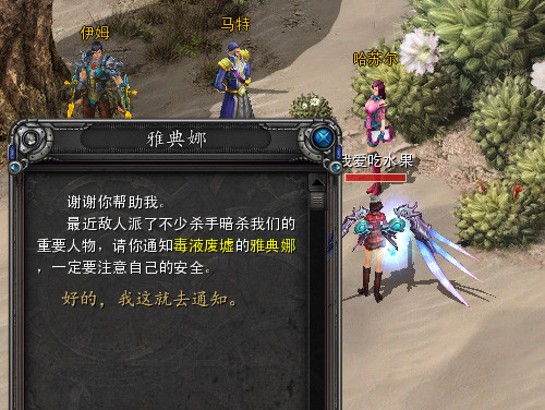 这个是最轻松的任务类型,需要做的就是帮NPC跑腿,去找另外一个NPC对话。关键的是记得用自由传送门,这样去其他地图就会特别快,实在不行就带回城药水,就怕捎完话后发现背包里没有传送的东西,那会很悲剧的。记得有一次自由传送门放仓库了,结果从巨龙谷跑回***,直接跑断腿T.T