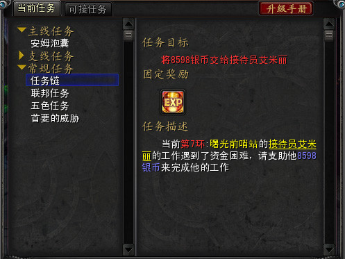 提交银币这个类型的任务也简单,估计大家做的时候都希望NPC找你要银币,只要给NPC万把银币就可以完成任务,难度和捎话差不多。同样注意带同心门就行了。