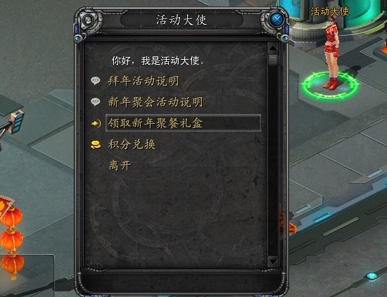 ***—活动大使(417,320)处领取,每天一次,可领取一个聚餐礼盒。礼盒可以开出:一种新年餐点和一定数量爆竹。