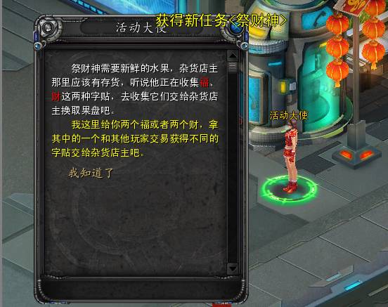 步骤二、找活动大使领取一个“祭财神”的任务,按照指引,收集“福”和“财”找到杂货店主。