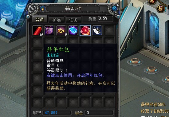 步骤三、右键点击“拜年红包”就有机会得到拜年礼物,有机会得到卫星广播、爆竹、新年时装—人龙传说等奖励。