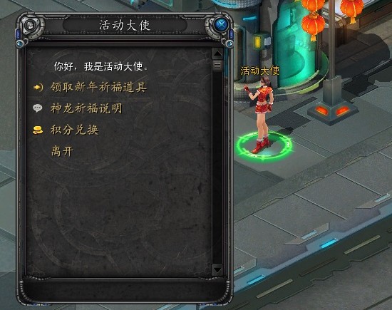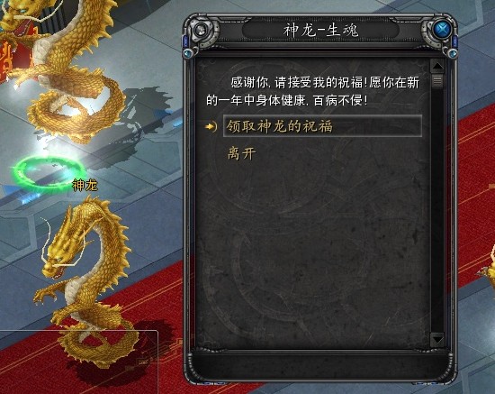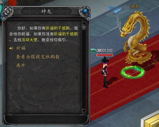 2.祈福:找到联邦大道上的神龙,向神龙提交祈福的千纸鹤进行祈福,每次提交,神龙都会给予经验、绑银和新春积分奖励。