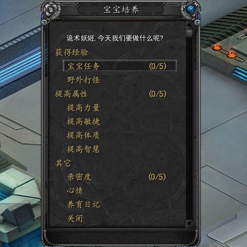打开宝宝面板,点击“培养”按钮,弹出“宝宝培养”面板。该面板用于宝宝在各个时期接取培养任务。