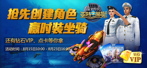 8月15日10:00--8月23日16:00,只要提前进入新服“永恒大陆”和“神迹”创建角色名,并于8月23日登录到新服。就有机会得到5级涡轮艇、方舟副官时装(永久)、钻石VIP(7天)和百万尚游币!