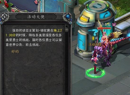 简介:对主策发泄不满的机会来了10月12日-10月14日21:30,骆驼将在多美星的某些角落出现。与太阳城活动大使对话,接取大战主策任务,活动大使将会随机传送一个玩家进入BOSS所在地,推到主策大大,返回太阳城领取大奖。