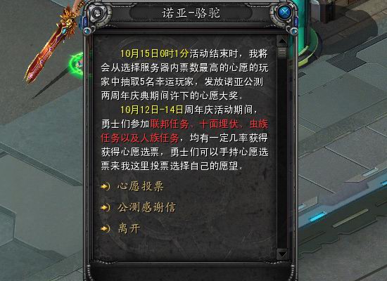 简介:10月12日周年庆系列活动开启后,可以到主策骆驼(415,315)处,提交心愿选票,从冰雪舞曲时装、钢甲龙坐骑和八级劳尔晶体中选择自己的心愿,并可以留下自己对诺亚的祝福。活动结束后将抽取所有心愿中人气最高的心愿活动,从中抽取5个幸运玩家,通过邮件给予奖励。