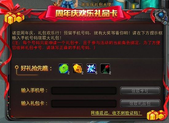 简介:到活动大使处点选【周年庆欢乐卡】,输入手机号码即可领取礼包。