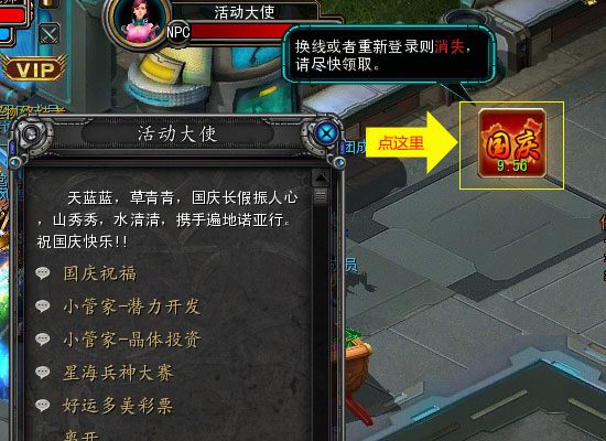 攻略:活动当天没隔两小时就会出现祝福图标,点击接受祝福系统就会给你两个字,记住那两个字,找与你那两个字配对的好友到太阳城NPC霍华德那里换经验,可能接受的词有:“祝福”、“诺亚”、“传说”、“国庆”、“快乐”,组合也容易,“祝福”+“诺亚”或国庆