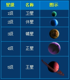 1、卫星、伴星、辅星、正星、王星:星球地图一共分为5种星级:星级从1星到5星不等,1星等级最低,5星等级最高。其对应关系为:
