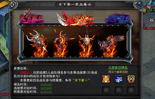 本服奖励:大量经验及金钱、天下第一荣誉勋章、本服前四名获胜队伍还可获得本服独有称号。